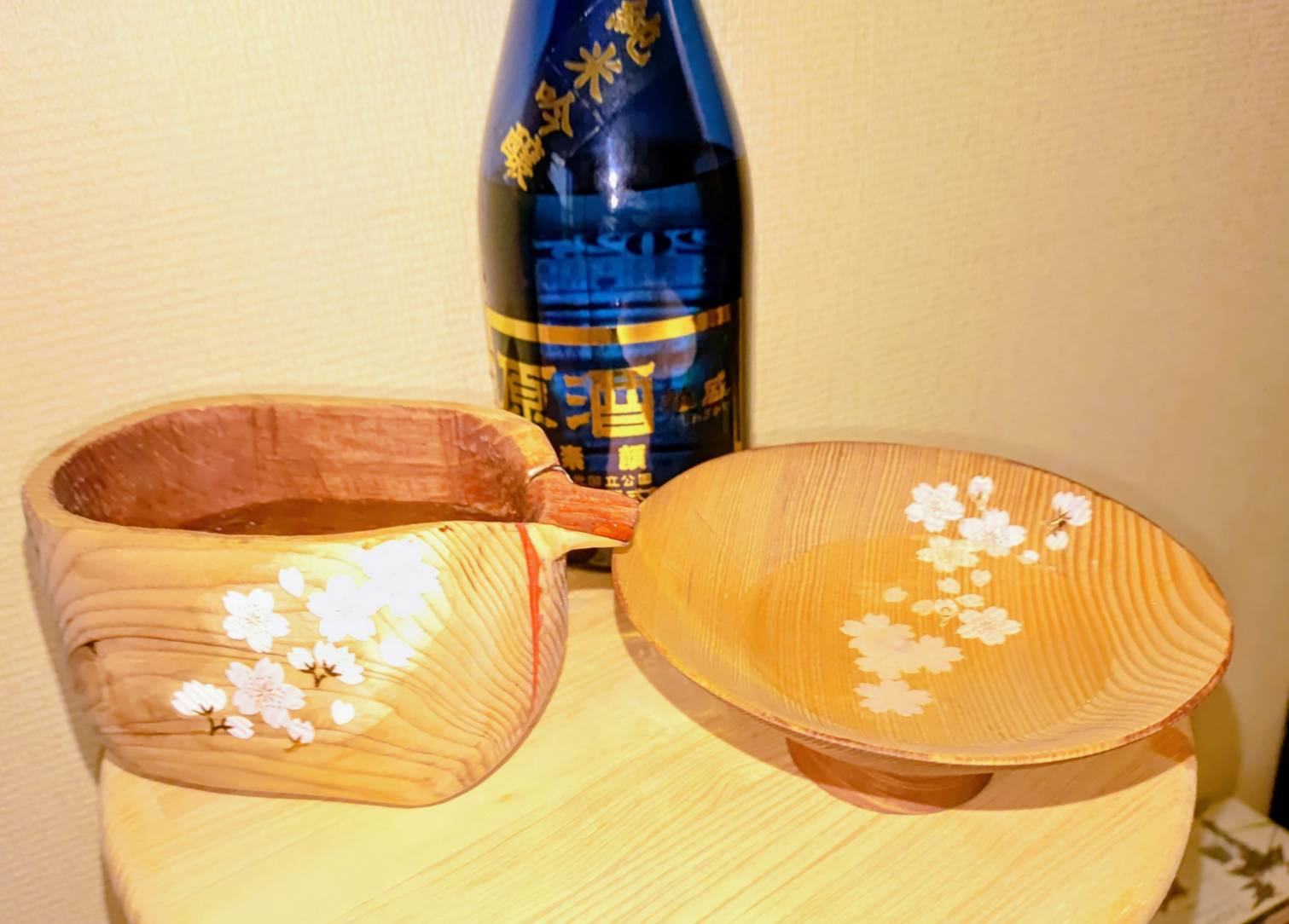 サワラの木、柿渋塗料を使用して作りました。拘りとしては、口当たりを良くする為に、飲み口を薄くしたことや、桜を散らし、お酒を注いだ時に綺麗に映えるようにしたことです。